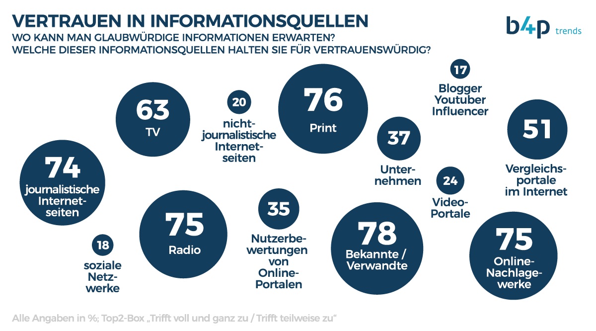 Demnach sehen 92 Prozent der Deutschen Social Media als besonders anfällig für die Verbreitung von Fake News. 81 Prozent denken sogar, dass Falschmeldungen, gemeinsam mit Hasskommentaren und Verleumdungen, eine Gefahr für die Demokratie darstellen. Positiv: Vier von fünf Deutschen achten heute mehr darauf, aus welcher Quelle Informationen stammen. Dabei vertrauen sie in erster Linie journalistischen Medien – vor allem die unter 30-Jährigen. Würde über ein Ereignis in den Print- und den Sozialen Medien sehr unterschiedlich berichtet werden, so würden sich 69 Prozent dieser Gruppe auf den Beitrag der Printmarken verlassen. Dieses Vertrauen wirkt auch in Social Media hinein: Facebook-Beiträge von Zeitungen und Magazinen werden von den Befragten als am glaubwürdigsten bewertet. Übrigens: Nur 7 Prozent der Deutschen halten einen Beitrag für glaubwürdig, weil er viele „Likes“ bekommen hat – und beweisen laut b4p trends so mehr Medienkompetenz, als mancher Skeptiker gedacht hätte.