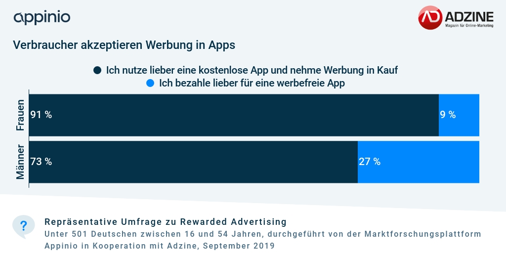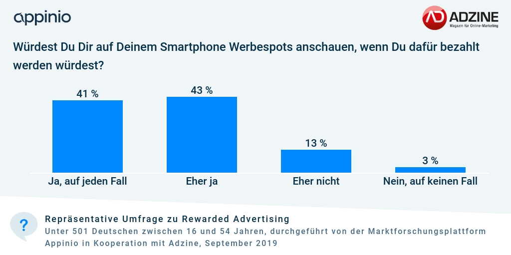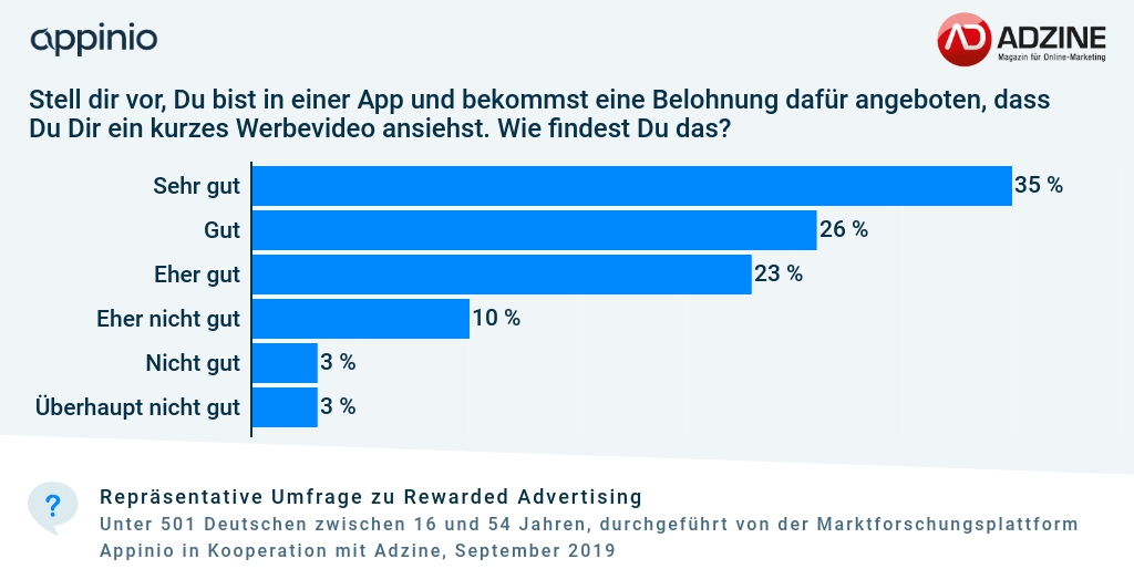 Belohnungen bekommen für das Anschauen von Online-Werbung – dieses Konzept finden 61 Prozent der Nutzer attraktiv. Besonders affin dafür sind Männer (65 versus 58 Prozent Frauen) sowie die Altersgruppe 23 bis 35 Jahre (66 Prozent). Die national-repräsentative Umfrage zum Thema Rewarded Advertising führte die Marktforschungsplattform Appinio zusammen mit dem Online-Marketing-Magazin Adzine durch. Befragt wurden 501 Deutsche zwischen 16 und 54 Jahren im September 2019.