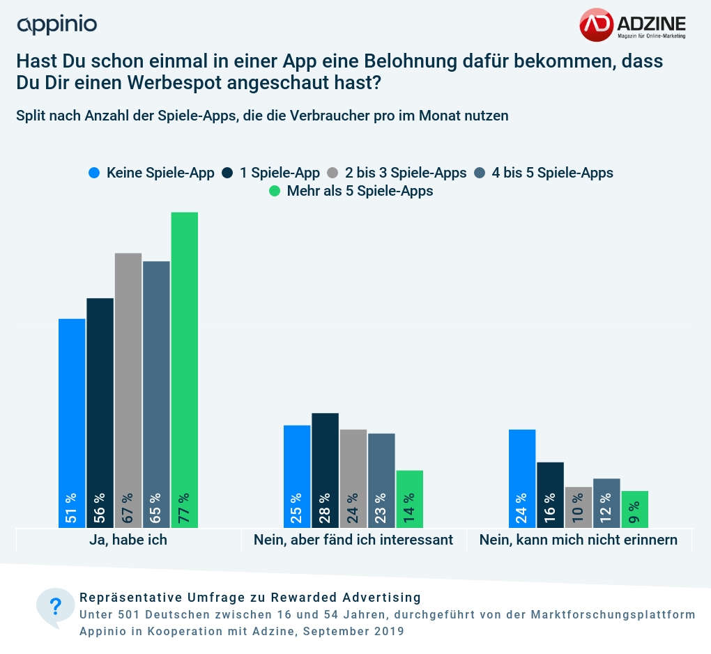 Knapp zwei von drei Befragten (64 Prozent) haben schon einmal in einer App eine Belohnung dafür bekommen, dass sie sich einen Werbespot angesehen haben. Je jünger, desto eher: Bei den 16- bis 22-Jährigen haben das 79 Prozent schon einmal erlebt. Bei den 23- bis 35-Jährigen sind es 69 Prozent; 57 Prozent bei den 35- bis 54-Jährigen. Rewarded (Video) Ads kommen besonders häufig in Gaming-Apps vor. 77 Prozent der Befragten, die mehr als fünf Spiele-Apps pro Monat auf dem Smartphone nutzen, haben schon Belohnungen durch Rewarded Ads erhalten.