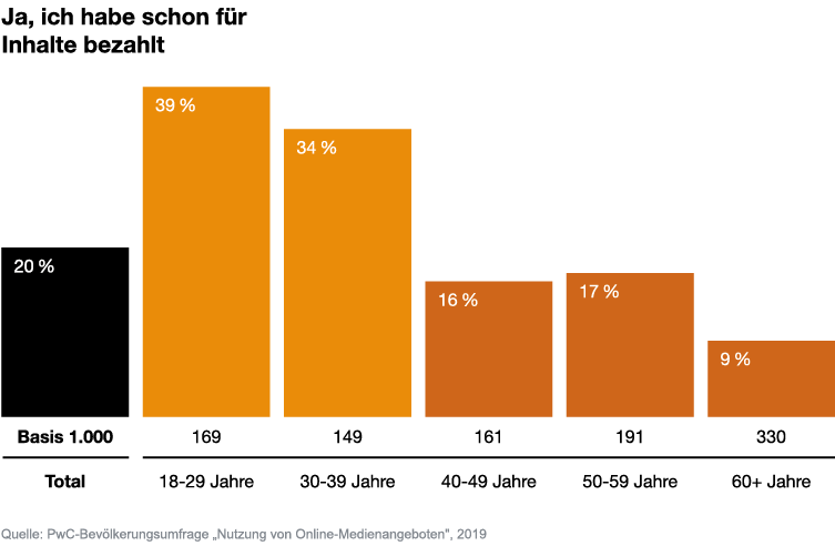 Fast 40% der 18- bis 29-Jährigen haben für Online-Inhalte von Zeitungen oder Magazinen schon mal Geld ausgegeben, zeigt eine PwC-Umfrage. Weitere 20% sind zumindest grundsätzlich bereit dazu. Auch unter den 30- bis 39-Jährigen ist die Zahlungsbereitschaft bemerkenswert hoch. Dagegen beharren die über 40-Jährigen auf kostenlosen Angeboten. PwC-Experte Ballhaus: „Die Verlage sollten sich auf die Generation Smartphone statt auf die Generation Internet konzentrieren“
