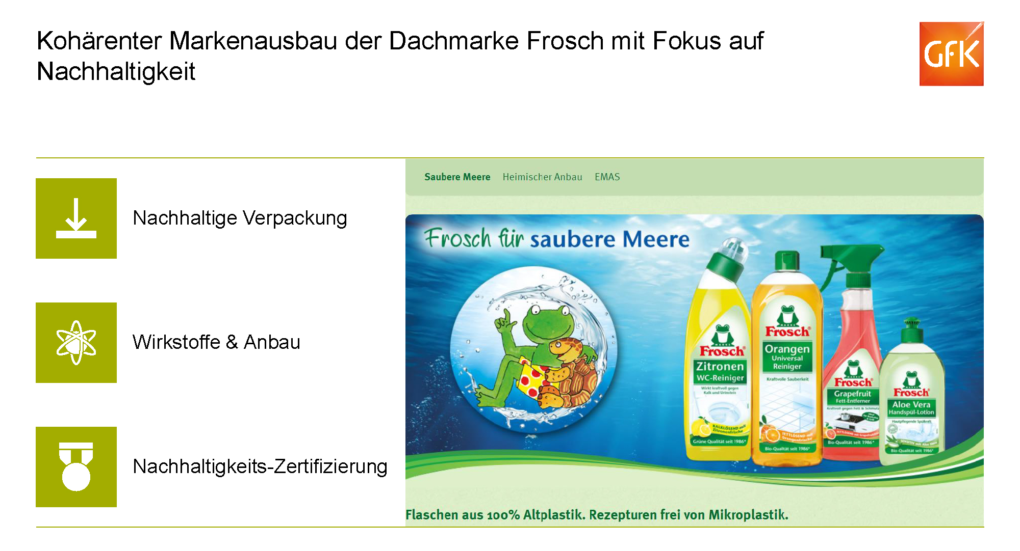 Trotz eines insgesamt prekären Umfelds konnte die GfK vier solcher Marken-Champions identifizieren, darunter die Marke Frosch des Reinigungsmittelherstellers Werner & Mertz. Laut GfK lässt sich der kontinuierliche Erfolg dieser Dachmarke vor allem auf einen kohärenten Sortimentsausbau mit Fokus auf Nachhaltigkeit zurückführen. So bestehen alle PET-Reinigungsmittelflaschen der Marke Frosch aus 100 Prozent Altplastik mit einem Anteil von 20 Prozent rPET aus der Quelle „Gelber Sack“. Darüber hinaus sind die Rezepturen frei von Mikroplastik und enthalten Wirkstoffe aus europäischem Anbau. Seine ganzheitlich-nachhaltige Ausrichtung zeigt der Reinigungsmittelhersteller Werner & Mertz mit all seinen Produkten. Die Vertrauensmarke Frosch sensibilisiert mit der Kampagne „Frosch für saubere Meere“ die Verbraucher auf positive Weise für relevante Umweltthemen.