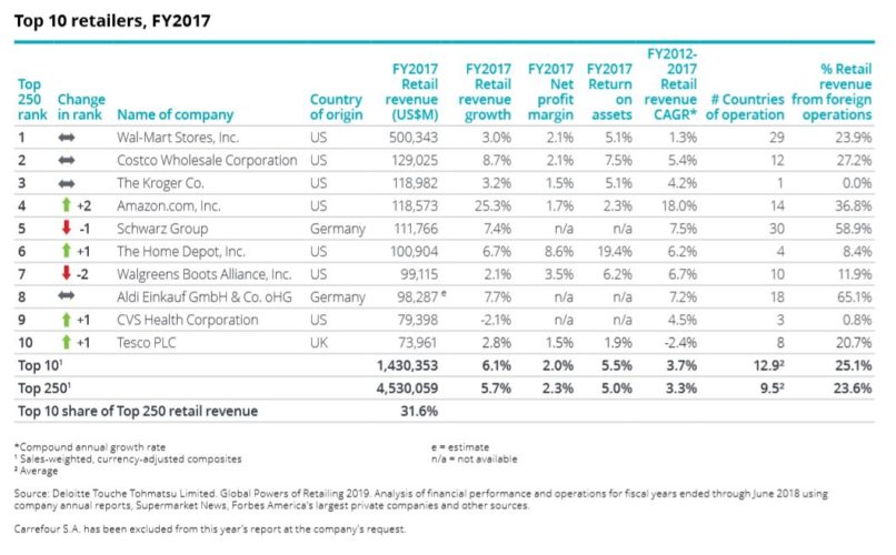Erneut ist der Online-Händler Amazon der Wachstumsführer im „Global Powers of Retailing“-Report 2019 von Deloitte. Im Geschäftsjahr 2017* steigt der Versandriese um zwei Plätze und steht nun auf Rang vier. Durch das enorme Umsatzwachstum von Amazon in Höhe von 25,3 Prozent wurde die Schwarz-Gruppe auf Rang fünf verdrängt, obwohl das deutsche Unternehmen um 7,4 Prozent und damit ebenfalls stark gewachsen ist. An der Spitze bleibt alles beim Alten: Ganz vorne liegt Walmart vor Costco und The Kroger.