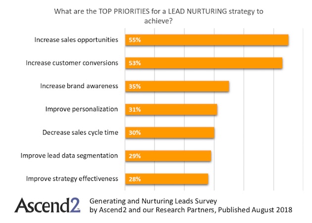 Die Marketingspezialisten gaben an, dass die obersten Ziele, die sie mit Lead-Nurturing erreichen wollen, darin bestehen, die Verkaufschancen zu erhöhen (55% stimmen zu) und die Conversions zu erhöhen (53%).