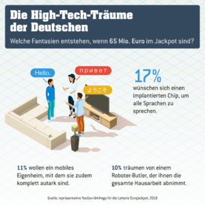 Mit einer Zeitkapsel in die Zukunft oder Vergangenheit zu reisen, haben wir uns wohl alle schon vorgestellt. Doch die Deutschen scheinen gerne im Hier und Jetzt zu leben. Was viele aber offensichtlich stört ist, dass sie sich nicht überall und mit allen Menschen auf der Welt richtig verständigen können. Abhilfe könnte ein Chip schaffen, der es möglich macht, alle Sprachen der Erde fließend zu sprechen. Deshalb steht ein solcher implantierbarer Chip ganz oben auf der Liste der High-Tech-Träume. Fast jeder Fünfte (17 Prozent) würde gerne im Alltag auf dieses Hilfsmittel zurückgreifen. „Wer viel reist weiß, wie schwer es manchmal sein kann, sich in einer anderen Sprache zu unterhalten. Ein Grund, warum der Sprachen-Chip vor allem bei jungen Leuten unter 24 Jahren und Menschen ab 55 Jahren ganz hoch im Kurs steht“, sagt Eurojackpot-Sprecher Axel Weber. „Sprachbarrieren würden damit der Vergangenheit angehören.“