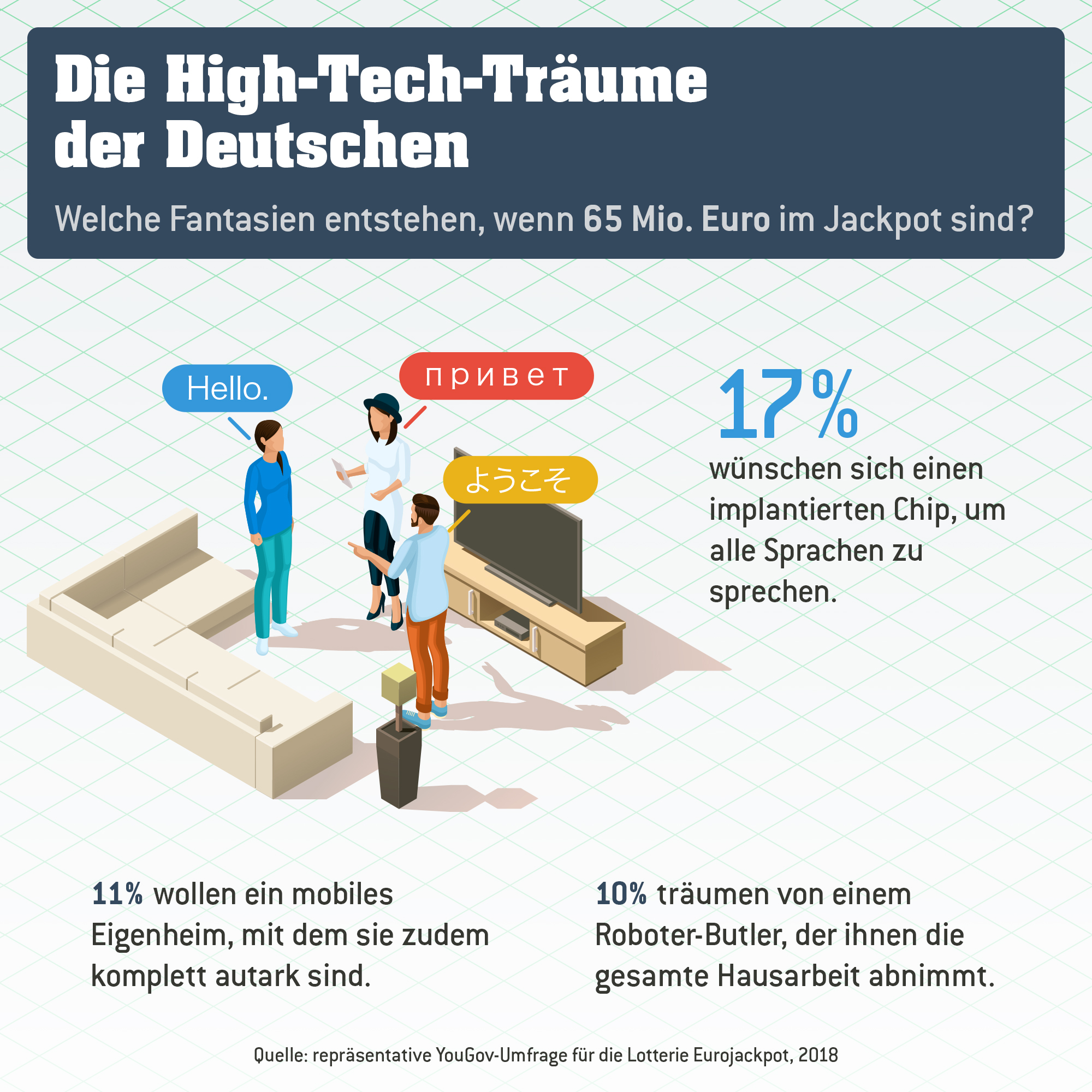 „Anscheinend beeinflusst auch die Region, wofür die technologischen Herzen der Deutschen schlagen“, so Axel Weber. „Vielleicht hilft ein Eurojackpot-Millionengewinn ja irgendwann tatsächlich, einen dieser Wünsche Realität werden zu lassen. Denn mit dem nötigen Kleingeld könnte der deutsche Erfindergeist sicherlich beflügelt werden.“