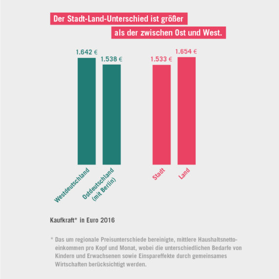Im Schnitt haben Westdeutsche eine Kaufkraft von 1642 Euro und Ostdeutsche von 1538 Euro. Die Kaufkraft unterscheidet sich somit zwischen Ost und West um 104 Euro und damit weniger als die Kaufkraft von Stadtbewohnern (1533 Euro) und Landbewohnern (1654 Euro), die 121 Euro auseinander liegen. Auch bei der Armutsgefährdung (relative Kaufkraftarmut) ist der Ost-West-Unterschied mit einem Prozentpunkt (Stand 2016) relativ gering. Neuere Daten des Statistischen Bundesamtes deuten darauf hin, dass bei der Armutsgefährdung der Ost-West-Unterschied zuletzt sogar noch kleiner geworden ist.