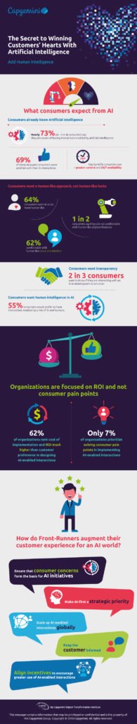 Verbraucher akzeptieren Künstliche Intelligenz (KI) im Service-Bereich: 73 Prozent haben bereits Chatbots, Stimmerkennung oder personalisierte Empfehlungen genutzt und 69 Prozent davon waren mit dem Ergebnis zufrieden. Unternehmen berücksichtigen jedoch die Auswirkungen auf das Kaufverhalten und den Wunsch nach Transparenz nur unzureichend. Der Mensch bleibt im Kundenkontakt dennoch weiterhin gefragt. Dies zeigt die globale Studie „The Secret to a Winning Experience with Artificial Intelligence: Add Human Intelligence“ von Capgemini. Für die Studie wurden 10.000 Verbraucher und 500 Führungspersonen in Unternehmen aus zehn Ländern, darunter Deutschland, befragt.