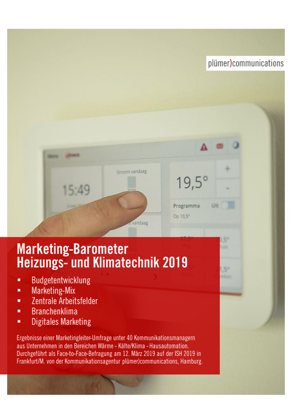 Über das „Marketing-Barometer Wärme – Kälte/Klima – Hausautomation 2019“: Das Marketing-Barometer wird von der Hamburger Kommunikationsagentur plümer)communications erhoben. Es untersucht die derzeit größten Herausforderungen für Marketing und Kommunikation in der deutschen Heizungs- und Klimabranche. Es erfasst außerdem die Entwicklung der Kommunikationsbudgets und fragt, wie Marketing-und PR-Manager die Zukunftsaussichten in ihrem Markt beurteilen. Für die diesjährige Erhebung wurden am 12. März 2019 im Rahmen von fragebogengestützten Face-to-Face-Interviews 40 verantwortliche Manager auf der ISH in Frankfurt/M. befragt.