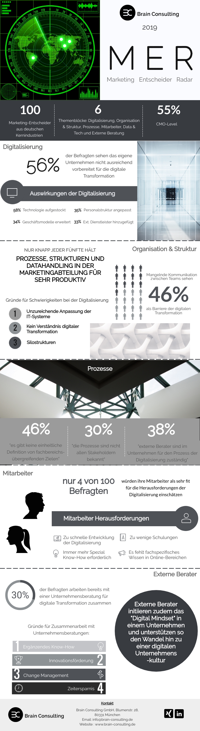 Trotz Investitionen in Technologie, Mitarbeiter und neue Geschäftsmodelle und obwohl Künstliche Intelligenz (KI), Machine Learning, Bots, Voice oder auch das Internet of Things (IoT) keine fernen Zukunftsvisionen sind: Mehr als jeder zweite Marketingentscheider (56 Prozent) sieht sein Unternehmen nicht ausreichend für die digitale Marketing-Ära gerüstet. Dies ist nur ein Ergebnis der zweiteiligen Studie Marketing Entscheider Radar 2019 (MER 2019) der Unternehmensberatung Brain Consulting, in welcher 100 Marketingentscheider zur Digitalisierung ihres Unternehmens befragt wurden. Im Fokus des ersten Teils stehen die Bereiche Organisation & Struktur der Unternehmen, Digitalisierung & Prozesse, Mitarbeiter & Unternehmenskultur sowie die Bedeutung externer Berater im Transformationsprozess.