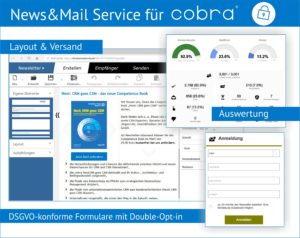 Weitere cobra Module, wie etwa das Firmendatenportal OptiServer, ergänzen den eigenen Datenstamm um eine Vielzahl neuer Potenzialadressen, die höchst simpel an den News&Mail Service übergeben werden können, nachdem man eine Werbe-Einwilligung erzielt hat.