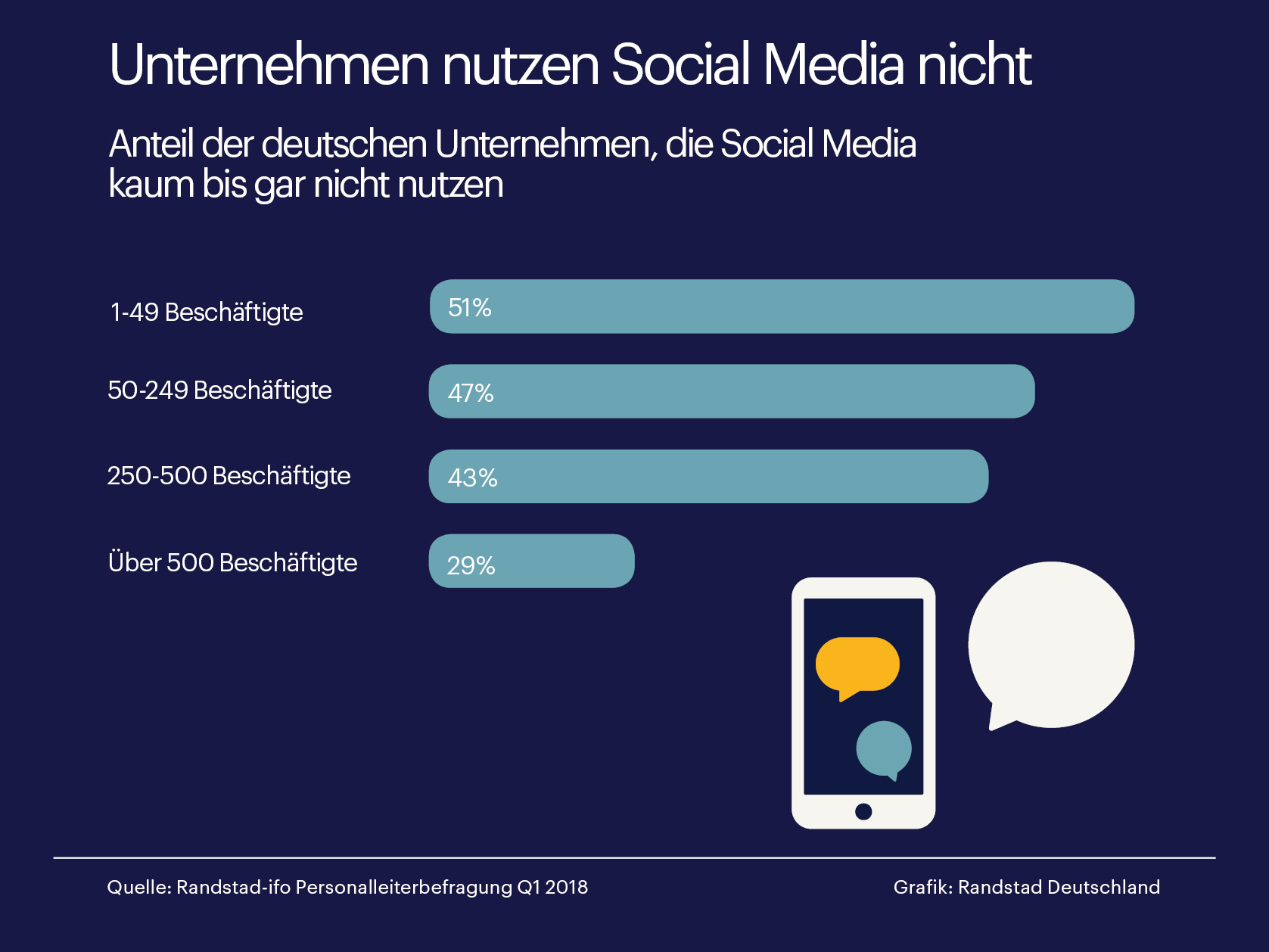 Die Gründe für die Nichtnutzung liegen in einer unklaren Digitalstrategie, erklärt Sebastian Seyberth, Social Media Expert bei Randstad Deutschland: „Häufig sind Führungskräfte vom Sinn sozialer Medien nicht überzeugt oder wissen nicht, wie sich diese produktiv einsetzen lassen. Dabei können alle Unternehmen, unabhängig von Größe oder Branche, mit einer durchdachten Social-Media-Strategie dazugewinnen.“