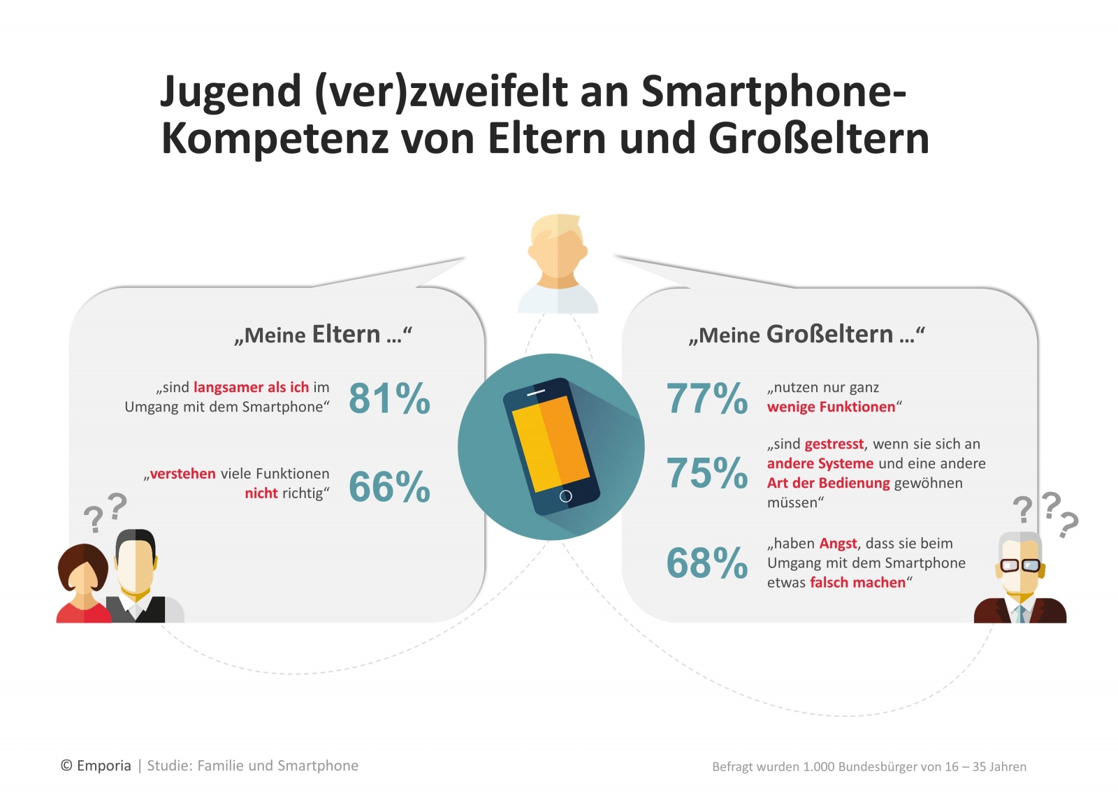 So sagen 81 Prozent der für die aktuelle Studie „Familie und Smartphone“ Befragten, dass ihre Eltern langsamer mit dem Smartphone umgehen als sie. Zudem kritisieren 66 Prozent der Kinder, dass ihre Eltern viele Funktionen des internetfähigen Handys nicht verstehen. In der Generation der Großeltern beschränken sich nach Aussage ihrer Enkel sogar 77 Prozent auf nur wenige Funktionen des Smartphones. Für die Studie hat der Mobiltelefon-Anbieter Emporia 1.000 junge Bundesbürger befragt.